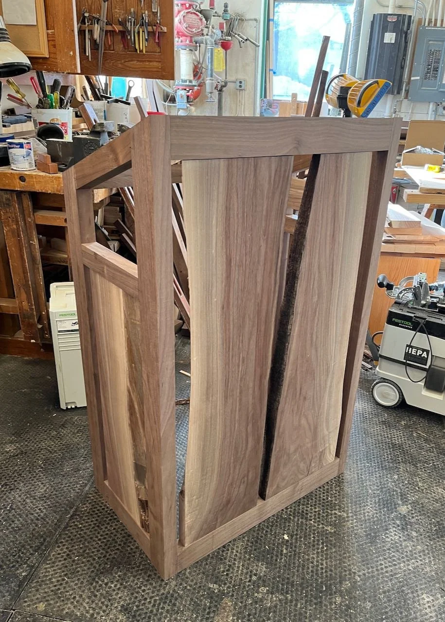 The design parameters were broad but required the new podium to be about 30% smaller than their existing “warship” (some speakers were lost behind it), be easily moveable, and have a sign on the face that could be switched out between Verse Like Water events and commencement for the college. Last of all, they asked that it be constructed of live edge walnut slabs.