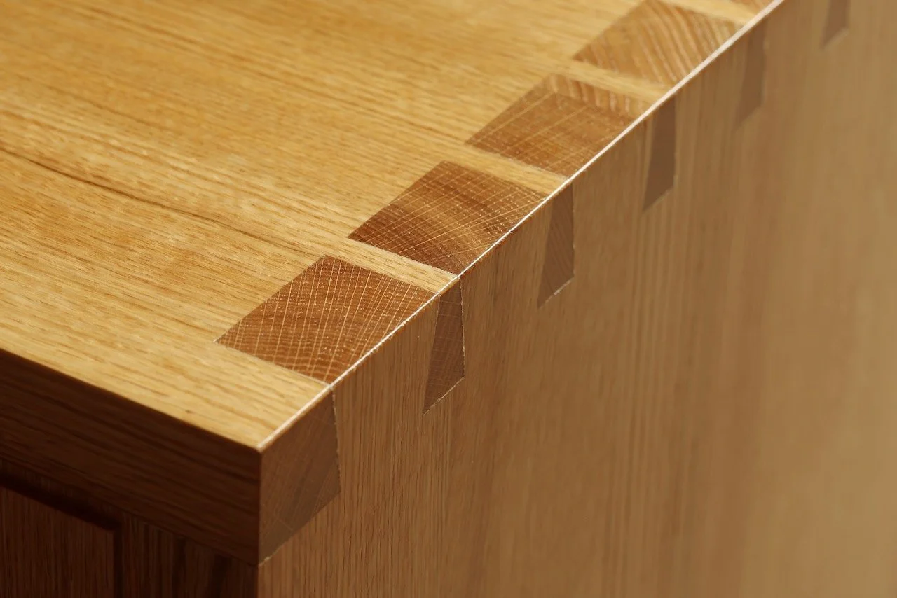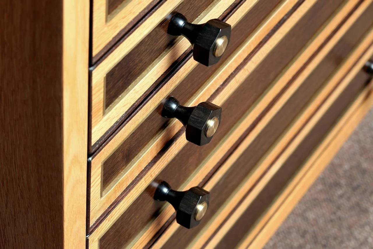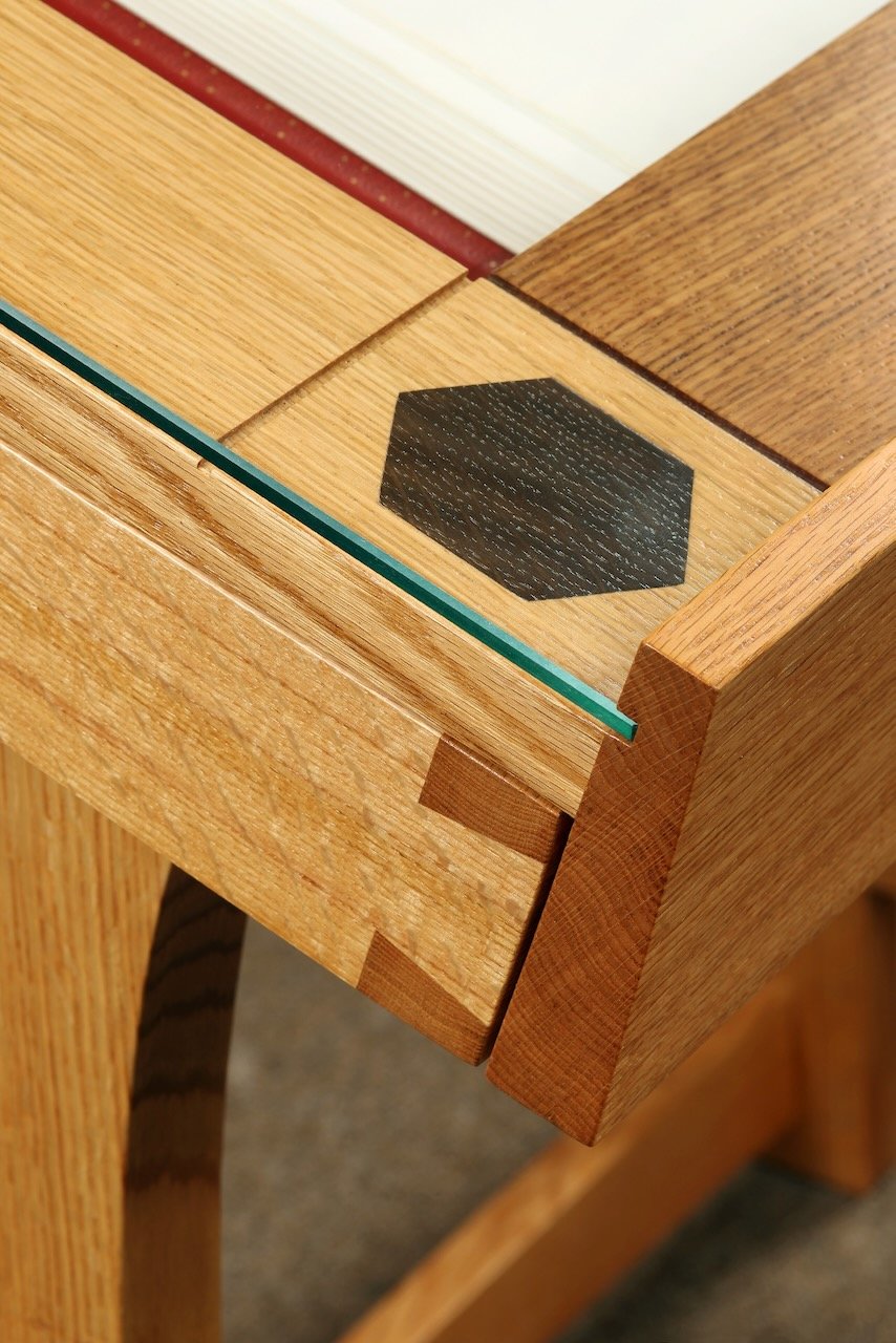 The seven-drawer cabinet is made of quarter-sawn red oak with Welsh oak and ebony accents, reflections of the Minnesota and Wales collaboration. The sweeping curves of the framework and hexagonal knobs are architectural references to Saint John’s Abbey’s famous Bauhaus church built in 1960 by Marcel Breuer. Leather-lined drawer bottoms have finger recesses to assist in easily removing the volumes.