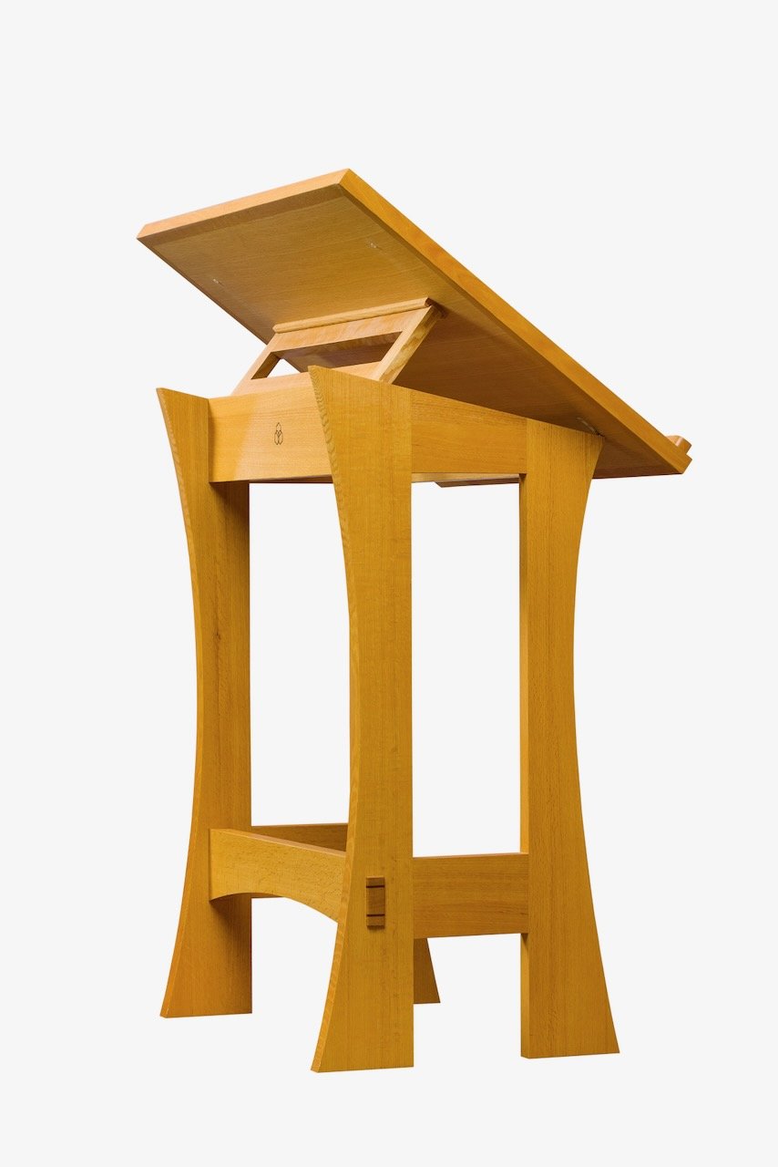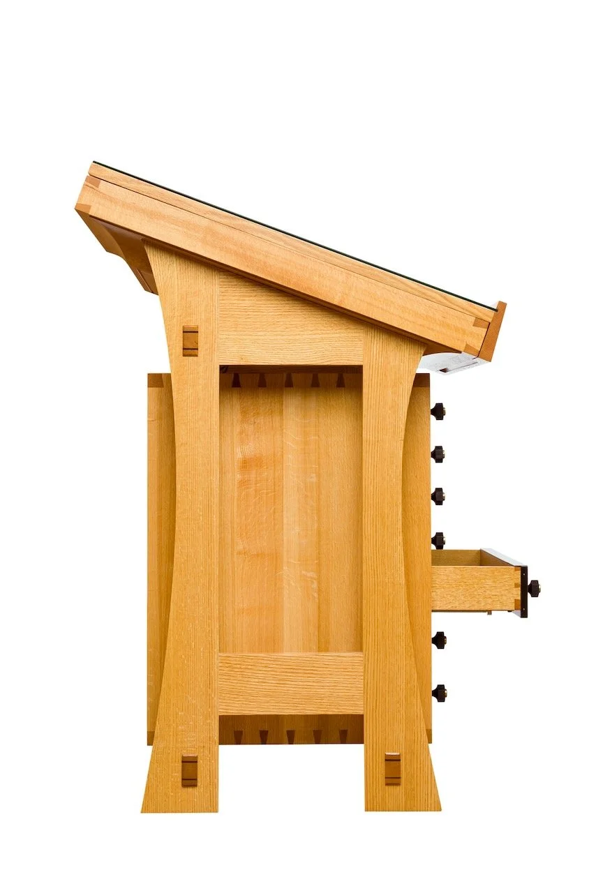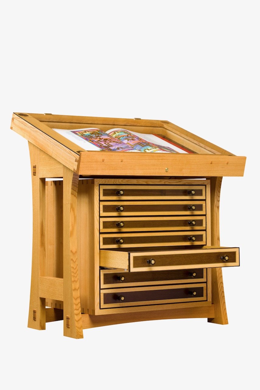 While the original Saint John's Bible resides in Collegeville, various editions of the Saint John's Bible are available for purchase. To accommodate for the viewing and storage of these sacred texts, Abbey Woodworking custom designed various displays and lectionaries for purchase. These stands put to use traditional joinery along with the beauty of quarter-sawn Red Oak to create pieces that reflect the artistry and craftsmanship that is the Saint John's Bible.
